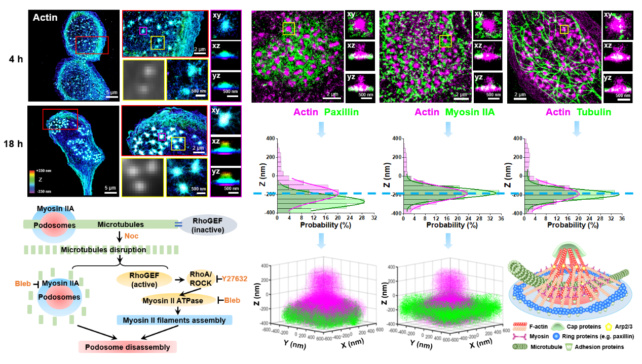 伪足小体尺寸微小,在巨噬细胞中往往以紧密聚集的簇状超结构形式存在,常规的显微成像难以对其进行有效观察和研究。同时,该结构受到细胞微丝、微管及多种信号通路的调节,但具体机制仍未完全阐明。因此,课题组利用自主搭建的、横纵分辨率为25/50 nm的单分子定位超分辨成像系统(Single-Molecule Localization Microscopy, SMLM)研究了巨噬细胞伪足小体的三维精细结构特征和微管骨架依赖的调节机制。发现体外培养的巨噬细胞可随时间的增加逐渐形成紧密聚集的伪足小体簇超结构,并发挥基质降解功能。基于SMLM成像结果,发展了信号叠加再重构的方法,清晰地描绘出巨噬细胞单个伪足小体的三维形貌,发现其呈“雪人”形状(snowman-like structure)而非传统认为的“圆屋顶”形状(dome-like structure)。在伪足小体“核心+环”的特征性结构中,进一步揭示出“肌球蛋白(myosin)环”位于“桩蛋白(paxillin)环”上方 ~ 90 nm处,且微管骨架可于肌球蛋白环层面贯穿伪足小体肌动蛋白核心,对伪足小体簇状超结构起到物理支撑作用。微管解聚药物诺考达唑会使巨噬细胞中伪足小体解体,先前认为这一过程主要与活化Rho/ROCK/Myosin信号通路相关,本文工作表明微管的物理支撑作用在伪足小体动态调控中亦起到关键作用。研究结果将丰富伪足小体纳米尺度的结构信息,并为理解巨噬细胞中基质降解伪足小体的调控机制提供新的思路。