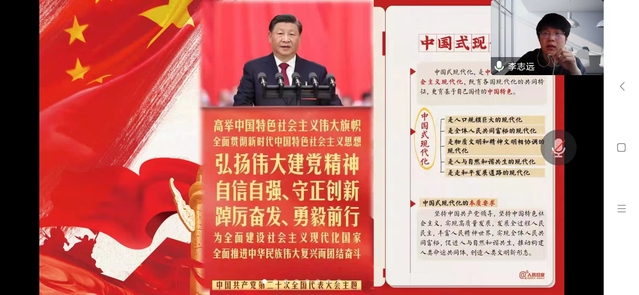 随后,马克思主义学院2022级硕士生三班党支部书记李志远以“奋斗百年路,启航新征程”为题,带领全体参会同志回顾了中国共产党带领全国各族人民探寻中国式现代化的艰辛历程,分析并总结了中国式现代化的历史意义及贡献,深入讲解了中国共产党的中心任务:以中国式现代化全面推进中华民族伟大复兴。李志远说,从近代以来的被动模仿到现当代共产党带领各族人民进行主动探索,最终形成中国式现代化道路,取得了历史性的重要成就。