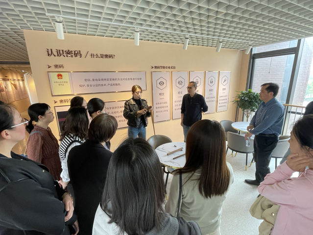 基地坐落于南开大学津南校区综合实验楼,包括密码科普模块和“豪密”爱国主义教育模块两个部分。跟随讲解员的带领,大家沿着展厅缓步前行,不时驻足观看,认真聆听讲解。在密码科普展区,用最早的密码工具——“斯巴达棒”带领大家认识密码,从密码诞生与发展的历程,到密码与战争,再到典型密码的算法和应用,“凯撒密码”、“图灵”、“密码奇才华罗庚”、“数字证书”,一个个趣味横生的知识,一件件鲜为人知的故事在眼前展开。在“豪密”爱国主义教育展区,大家了解了“豪密”的诞生与应用,深刻体会到周恩来总理作为南开杰出校友为中国密码事业的呕心沥血、鞠躬尽瘁,为南开密码的传承与发展倍感骄傲。