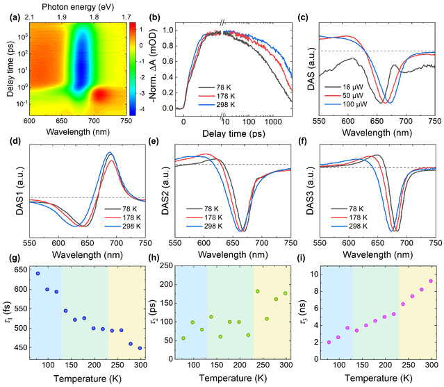 图2 CPI量子点温度依赖的载流子动力学特性。a)室温瞬态吸收光谱。b)三种物相对应温度的基态漂白信号动力学。不同颜色的温度区间对应各自的物相。c)不同激发强度下,瞬态吸收光谱通过全局拟合提取的弛豫过程光谱。d-f)三种物相对应温度的三个动力学过程的弛豫过程光谱。g-i)三个动力学过程寿命随温度的变化。