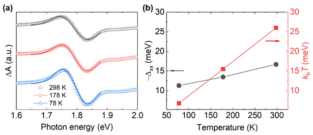 图3 a)三种物相对应不同温度在0.3 ps的瞬态吸收光谱。b)从(a)中提取的双激子结合能Δxx与热能KbT随温度的变化。说明双激子室温解离为单激子。
