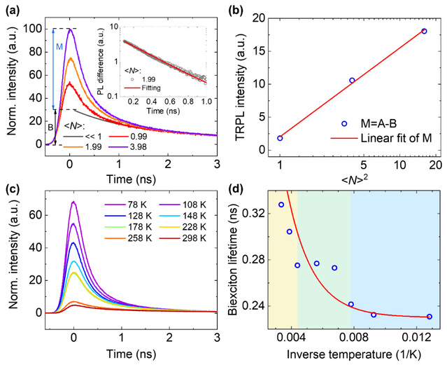 图1 CPI量子点双激子复合动力学的温度依赖性。a)功率依赖的时间分辨荧光光谱。插图为提取的双激子寿命。b)多激子组分强度与载流子浓度的关系,证明该组分为双激子。c)温度依赖的时间分辨荧光光谱。d)从(c)中提取的双激子寿命随温度的变化。不同颜色的温度区间对应各自的物相。