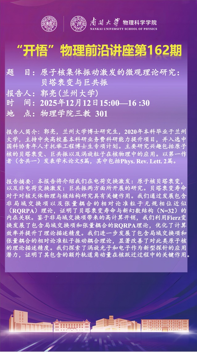 【“开悟” 物理前沿讲座 (第162期)】原子核集体振动激发的微观理论研究:贝塔衰变与巨共振