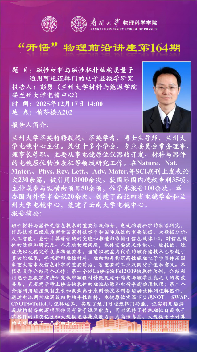 【“开悟” 物理前沿讲座 (第164期)】磁性材料与磁性拓扑结构类量子通用可逆逻辑门的电子显微学研究